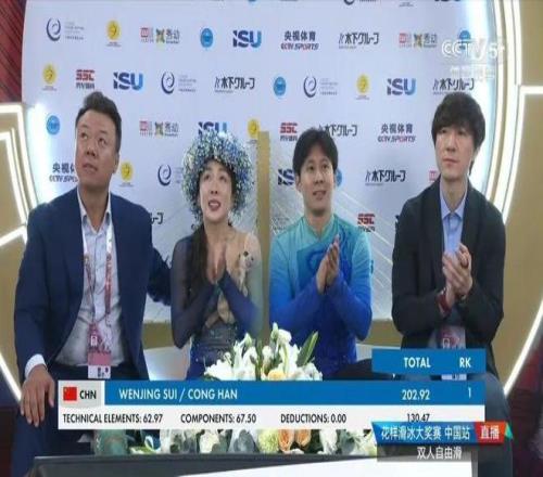短節(jié)目中,第一組出場(chǎng)的兩人開場(chǎng)單跳出現(xiàn)失誤,最終以72.45分暫列第三,這個(gè)分?jǐn)?shù)在整場(chǎng)比賽過程中曾長(zhǎng)時(shí)間穩(wěn)居短節(jié)目榜首,直到最后兩對(duì)選手登場(chǎng)才被超越,足以見得他們即便久疏戰(zhàn)陣,仍具備強(qiáng)勁的競(jìng)爭(zhēng)力。隋文靜賽后坦言,因合樂時(shí)間不足一個(gè)月,加上久別賽場(chǎng)過于興奮,節(jié)奏上有些壓不住,但對(duì)于動(dòng)作的質(zhì)量仍有信心。
