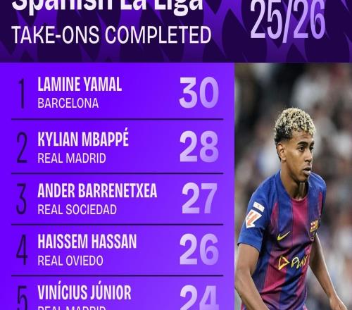 本賽季西甲完成過人最多榜:亞馬爾30次居首,姆巴佩28次第二