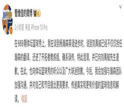 此外,5日早些時候,解說員管維佳發(fā)文致歉,稱“楊瀚森的翻譯劉禹鋮進入開拓者的教練組”的消息系誤傳。